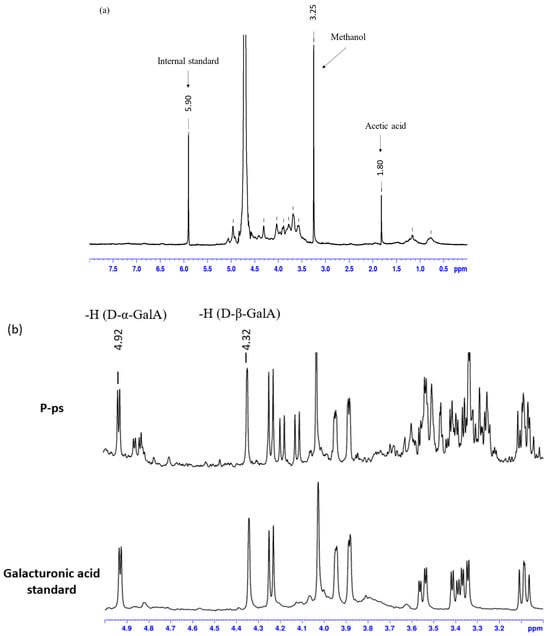 1H-NMR analysis of the samples after mild alkaline hydrolysis allowed the simultaneous quantification of acetic acid and methanol esterified with the galacturonic acid residues in the pectic polysaccharides. The released methanol resulted in a single signal at δ 3.25 ppm, while hydrogens belonging to the -CH3 of acetic acid were detected at δ 1.83 ppm, as shown in Figure 4a for pomegranate peel as an example. Galacturonic acid content was also evaluated by 1H-NMR in order to obtain the number of moles with the same instrumentation. Assignments of the peaks for the estimation of GalA content are shown in Figure 4b (on P-ps as an example), where the integrals of the anomeric α- and β- hydrogens are highlighted.
