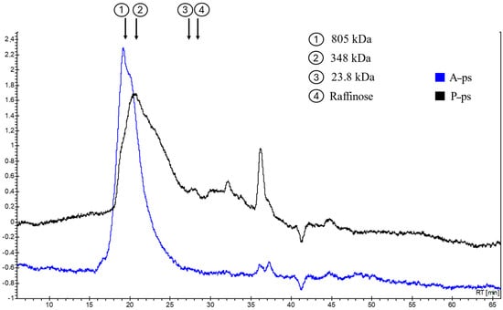 Polysaccharides from both by-products showed a main peak with molecular weights ranging from 805 to 348 kDa. A-ps exhibited a relatively narrow peak with a visible shoulder, highlighting the presence of two fractions characterized by different molecular weights. Data recorded for A-ps align with the literature, which reports a wide range of molecular weights (approximately from 200 to 1100 kDa) when apple pectins are recovered through acidic extraction []. P-ps, ranging from 348 to 805 kDa, are also consistent with the literature []; however, they are additionally characterized fractions with smaller molecular weights (<23 kDa). Considering the elution time of raffinose (28 min), all the following peaks observed in both chromatograms are likely due to degradation products.