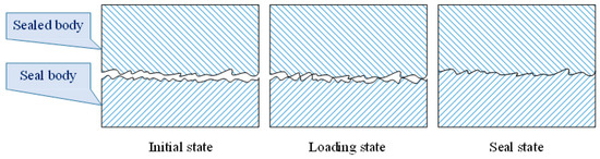 The essence of the metal seal is to isolate the sealed space and prevent mass exchange with the surrounding medium [8,9]. Under ideal conditions, the surface of the sealing body can be fully fitted, forming a tight contact that ensures effective sealing. From a microscopic perspective, the metal-sealing surface is fitted by rough surface contact. The sealing of the metal-sealing element can be regarded as uneven tooth surface engaging under microscopic conditions, as shown in Figure 1 [10]. In the absence of any external force on the contact surface, only the micro-bumps on the surface contact each other, as depicted in the initial state in Figure 1. With the increase in load, the contact surface of the bulge increases with the degree of deformation. Eventually, the bulge begins to deform or embed with each other (Figure 1 loading state). As the load continues to be applied, the micro-clearance of the initial surface roughness is blocked, resulting in most of the mating surface being chimeric and, thus, achieving the metal-sealing effect (Figure 1 seal state) [11,12].