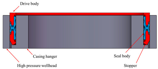 In response to the specified application requirements, a subsea wellhead sealing device has been designed. It is positioned within the annular space between the high-pressure wellhead and the casing hanger. Upon activation of the sealing device’s feeding tool, its sealing component compresses the high-pressure wellhead and casing hanger, ensuring a metal seal. The detailed structure of the sealing device is illustrated in Figure 3.