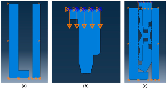 Constraint setting in the axisymmetric model. (a) The verbal constraint between the casing hanger and the high-pressure wellhead; (b) the constraint of the feeding body; and (c) global constraint.