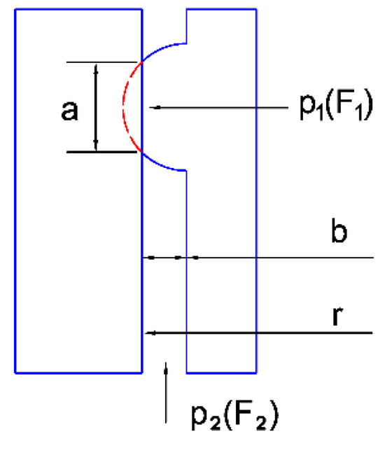 The driving sleeve drives the sealing body to open so that the flange of the sealing body is in contact with the high-pressure wellhead and casing hanger. After sealing, the flange deformation of the sealing body is shown in Figure 7. In the figure, p1 is the pressure acting on the flange of the sealing body, p2 is the pressure in the well, a is the width of the contact surface after the deformation of the flange of the sealing body, b is the cross-section width of the annular space in the well, r is the theoretical radius of the sealing surface, F1 is the normal force acting on the flange, and F2 is the normal force acting on the annular surface of the well pressure. The material hardness of the sealing ring is smaller than that of the high-pressure wellhead and casing hanger. Therefore, the deformation of the sealing ring is the main factor, and the deformation of the high-pressure wellhead and casing hanger is ignored here [24].