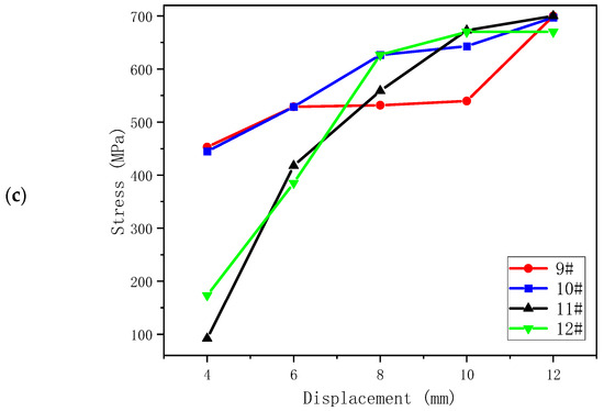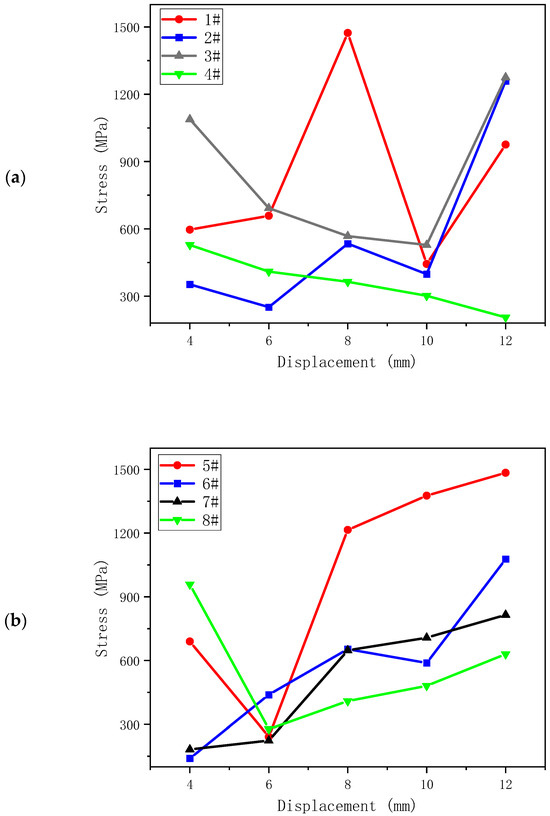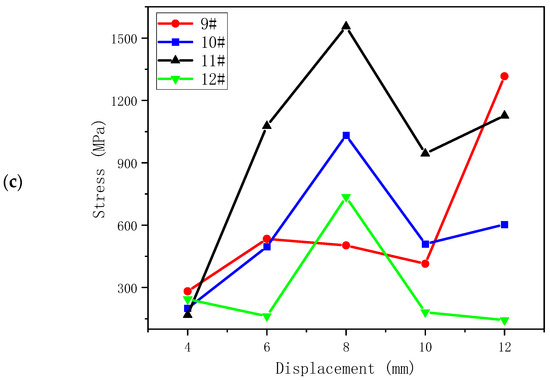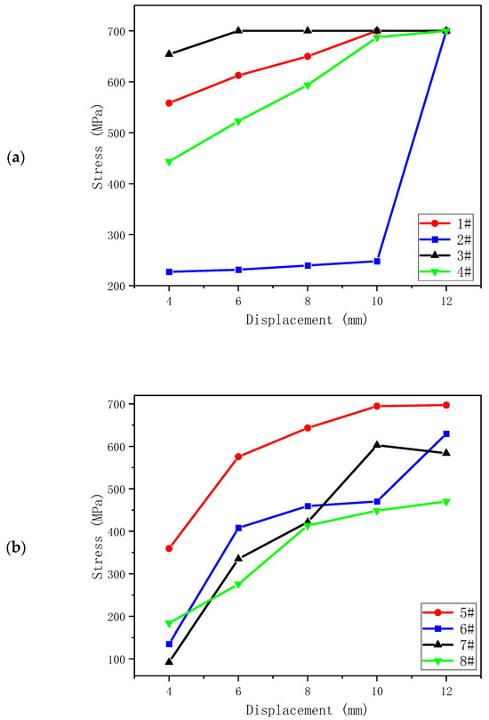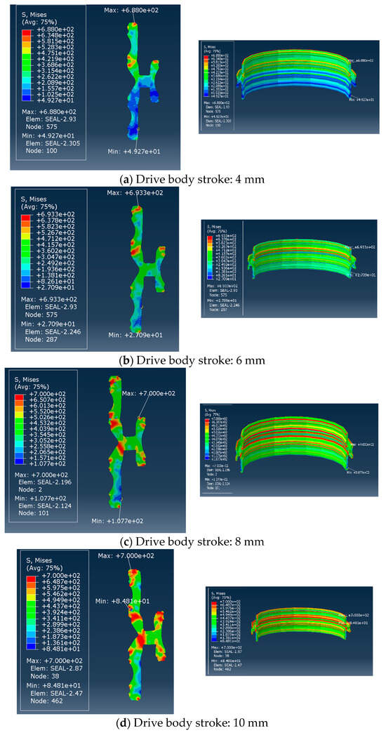 The calculation results of the sealing ring under 5 strokes are summarized in Figure 10. For flanges 1–4, after the sealing ring is lowered into the annular space between the casing hanger and the wellhead for 4 mm, flange 1 on the sealing body has mutual extrusion with the casing hanger. The stress increased from 0 to 557 MPa. As the distance increased, the maximum equivalent stress reached 700 MPa, which was nearly 3.5 times the yield limit of the material. This feature can provide better sealing performance. Among the range of flanges 5–8, the stress of number 6 first changes slowly due to the small initial contact area. However, with the increase in displacement, the extrusion stress rapidly rises to 409 MPa. Subsequently, the maximum equivalent stress rapidly reaches 630.542 MPa, indicating that sealing performance has been achieved. Under the extrusion between the casing hanger and high-pressure wellhead, the stress at flange 11 in 9–12 rapidly increases to 419 MPa. With the increase in distance, the equivalent stress rapidly increases to 700 MPa, realizing the sealing performance.