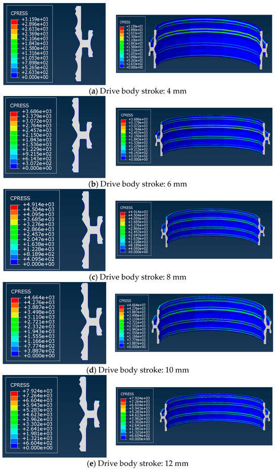 During the above installation process, the sealing body is fitted with the casing hanger and the high-pressure wellhead. The driving body is pressed into the annular space of the sealing body, and the overall displacement of the excitation is 12 mm. To analyze the stress and deformation state of the sealing body when the driving body is pressed with different strokes, the drive body will move down from the assembly state and press into the seal body with strokes of 4 mm, 6 mm, 8 mm, 10 mm, and 12 mm, respectively. The force and deformation of the sealing body are analyzed, and the calculation results are presented in Figure 9.