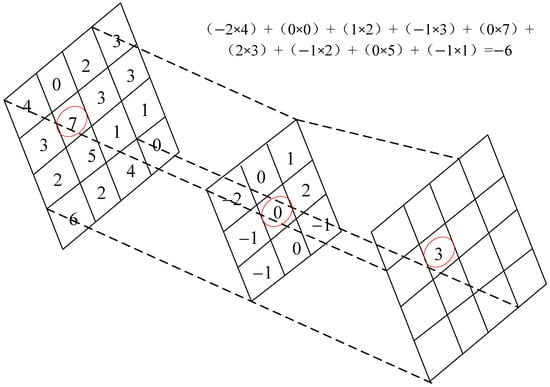 The convolutional neural network (CNN) is comprised, primarily, of three fundamental layers: a convolutional layer, a pooling layer, and a dense layer, each contributing significantly to its widespread adoption in the realm of image recognition. CNNs harness robust convolutional and pooling operations to effectively extract salient image features and seamlessly fuse them, leading to unparalleled recognition efficiency and performance, as documented in various studies [26,27,28,29]. Within the convolutional layer, an array of distinct convolutional kernels is employed to convolve with the input data, subsequently applying a bias and passing the result through an activation function to generate multiple feature maps. This computational flow, encapsulating the core principle of convolution, is visually represented in Figure 1.
