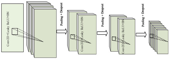 The third module takes the same architecture as the second module, with the difference of using three consecutive convolutional layers for 32 filters of size (3, 3), using Leaky ReLU as the activation function. Batch normalization and average pooling layer operations are then performed and the feature map size becomes (120, 120, 24).