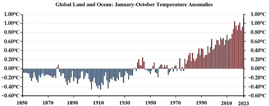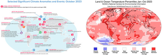 - NOAA National Centers for Environmental Information, Monthly Global Climate Report for October 2023. November 2023. Available online: https://www.ncei.noaa.gov/access/monitoring/monthly-report/global/202310 (accessed on 28 November 2023).