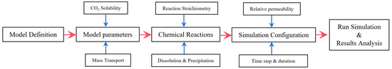 The General Equation-of-State (EOS) Compositional Reservoir Simulator, GEM, is adopted for modeling aqueous solubility and geochemistry on CO2 storage in offshore basins. The flowchart of the methodology implemented in CMG is displayed in Figure 3.