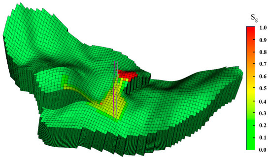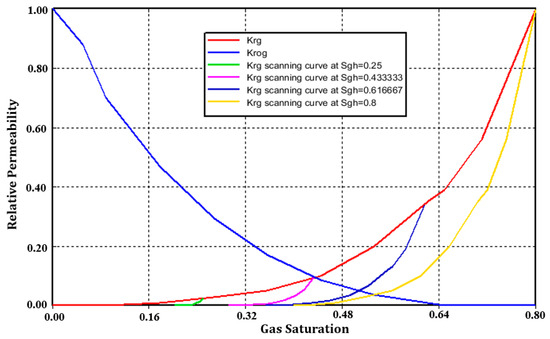 Gas relative permeability hysteresis is considered by adjusting the maximum residual gas saturation, and the maximum CO2 residual saturation is 0.4. The relative permeability of CO2 () versus gas saturation () is shown in Figure 4.