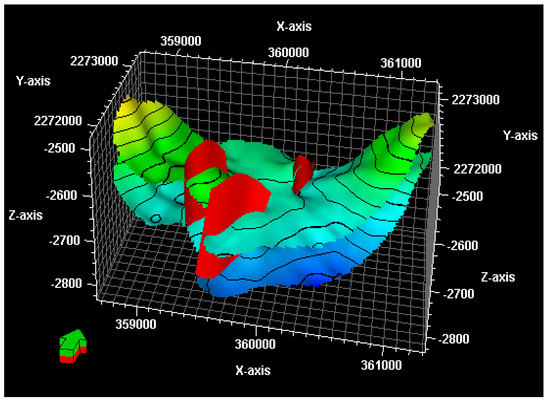 Three-dimensional model of the formation (light green layer) and fault (red planes) setting in the Wushi basin.