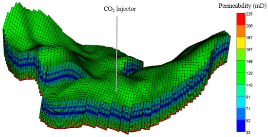 The Wushi basin, located in the southern part of China, is one of the most favorable locations for oil and gas accumulation (Figure 5). The target CO2 injection formation for this investigation is the Wei-2 formation. Based on the geological and petrophysical characteristics revealed by the borehole analyses, a Wei-2 sandstone formation, with a thickness of about 150 m, displays a strong lithological heterogeneity. The upper part of the Wei-2 sandstone formation comprises thick gray mudstone, maintaining caprock integrity. The Wei-2 formation is truncated by three faults, and the strike of the faults runs NE to SW (Figure 6). The permeability of the multilayered reservoir was calculated by the Sequential Gaussian Simulation method, using the SGSIM code (Figure 7).