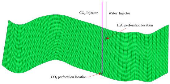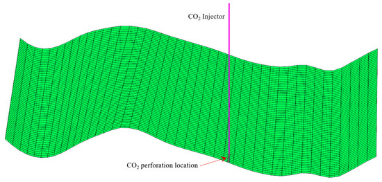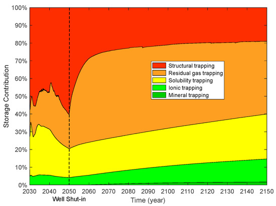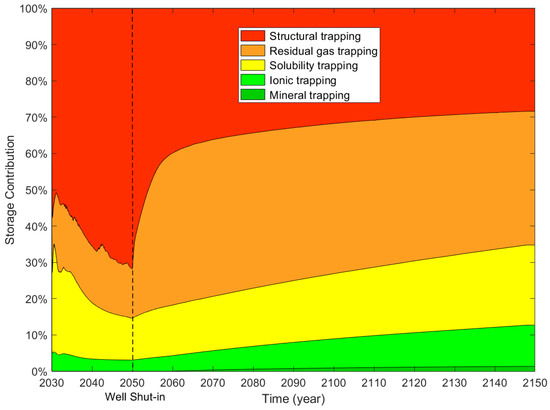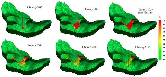 Figure 10 shows the spatial mobility and distribution of CO2 saturation over time. Due to the density difference between the supercritical CO2 and the aqueous phase, the low-viscosity CO2 tends to migrate to the top of the geological formation. The highest concentration areas of CO2 saturation are observed in the convex topography near the injection well. After the well shut-in, CO2 continues to migrate to the anticline due to structural trapping (1 January 2060). After that, the CO2 plume continues to move forward due to the accumulation of excess CO2 in the anticline. At the end of the simulation period (1 January 2150), most of the CO2 plume was still trapped at the top of the anticline in the Wei-2 formation.