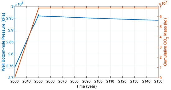 Injection profile of the supercritical CO2 during the simulation (blue line is well bottom-hole pressure; orange line is cumulative CO2 mass).