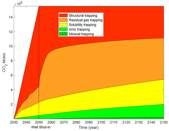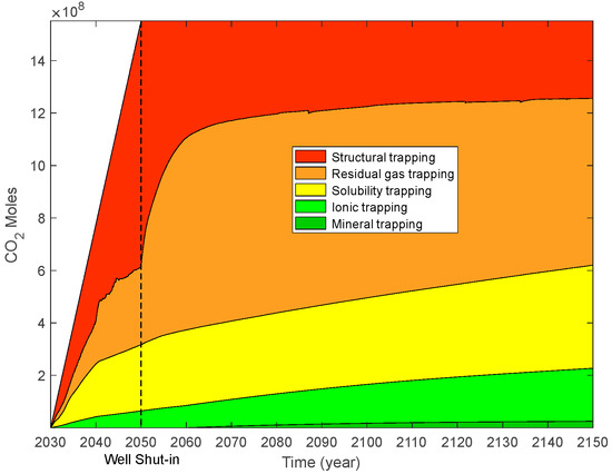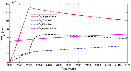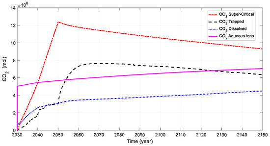 The CO2 mole changes at various simulation times are plotted in Figure 11. At the beginning of the CO2 injection, the supercritical CO2 is injected and mixed with the initial water in the formation, forming a dissolved aqueous phase. The supercritical CO2 continues to increase to a maximum value of 1.32 × 109 moles in 2050. Due to the existence of initial water in the formation, the CO2 aqueous ions and dissolved CO2 measure 5.04 × 108 and 0.575 × 108 moles in 2030, respectively. At the end of the simulation, the CO2 aqueous ions and dissolved CO2 measure 6.8 × 108 and 4.0 × 108 moles in 2050. The dissolved-CO2 curve shows an increasing trend during geological carbon storage. During the CO2 injection period, the amount of CO2 dissolved in the aqueous phase is more than that of trapped CO2. There is a sharp increase in trapped CO2 after the well shut-in, mainly due to CO2 being trapped by the anticline.
