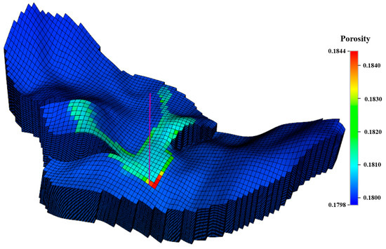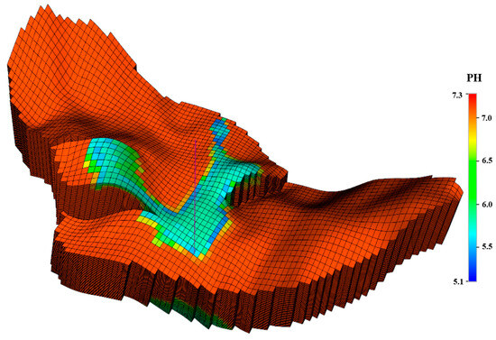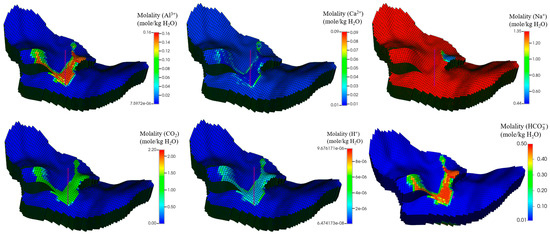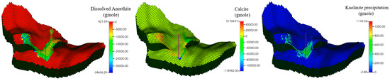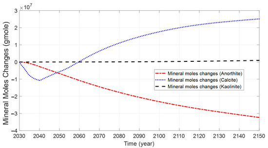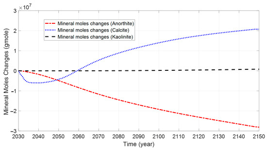 Figure 12 and Figure 13 show the mineral moles changes in anorthite, calcite, and kaolinite. Figure 14 shows the ion mole changes at the end of the simulation. It can be observed that the kaolinite is precipitated in the aqueous phase, while the anorthite is dissolved. Calcite is initially in the dissolved state, gradually converting to a precipitated state due to the continued geochemical reactions in the late storage period. The mole changes for anorthite, calcite, and kaolinite are −2.79 × 107, 2.07 × 107, and 7.85 × 105 at the end of the simulation, respectively. As CO2 is dissolved in the aqueous phase, there is a decrease in PH in the CO2 migration areas (Figure 15). The porosity variation was insignificant at the end of the simulation (Figure 16). Anorthite, a calcium-rich mineral, is dissolved to provide Ca2+ and Al3+ in the aqueous phase due to the formation of carbonic acid. Ca2+ and Al3+ contribute to the precipitation of calcite and kaolinite with time. The mineral change in calcite is more than that of kaolinite precipitation. The precipitation of calcite consumed more Ca2+ compared with Al3+ consumed by kaolinite precipitation. The mole changes in Al3+ is more obvious than that in Ca2+ 100 years after the injection period.