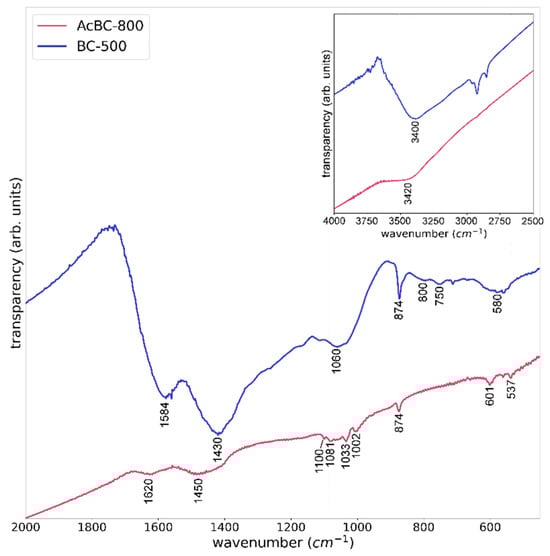 FTIR spectra of AcBC-800 and its precursor (BC-500) in the 2000–500 cm−1 range, with the 4000–2500 cm−1 range shown in the inset of the plot.