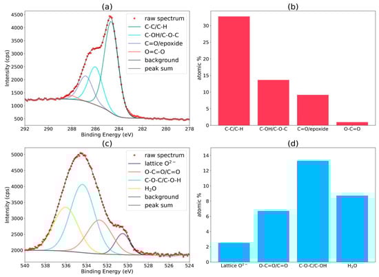 (a) C 1s spectrum of AcBC-800; (b) Elemental concentrations (at. %) determined from C 1s spectrum corresponding to identified functional groups; (c) O 1s spectrum of AcBC-800; (d) Elemental concentrations (at. %) determined from O 1s spectrum corresponding to identified functional groups.