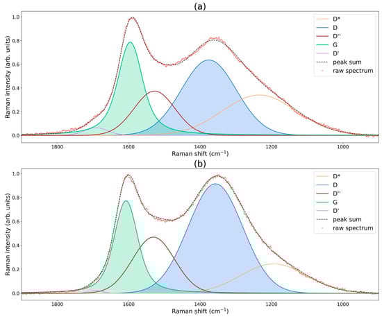 Peak fitting was performed in the region of interest, i.e., 1900–900 cm−1, which has a characteristic pattern for carbonaceous materials. In particular, the G and D bands occurring in this region were analyzed to gain insight into the structure of the samples. Peak fitting was performed in OriginPro 8.5 following the procedure described by Lopez-Diaz et al. where the spectra were fitted with five peaks (D*, D, D″, G and D′) [].