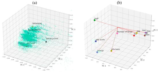 (a) PCA score plot of APIs in a space defined by the three principal components (PC1, PC2, and PC3); (b) PCA loading plot showing the contributions of physico-chemical properties of APIs to each principal component (Pol—polarizability, MW—molecular weight, Hacc/Hdon—number of proton acceptors/donors, PSA—polar surface area).