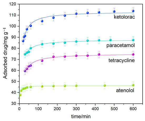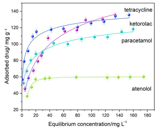 The ionic strength and pH values of the working solutions for the adsorption kinetics and equilibrium studies were adjusted to the values ensuring maximum removal efficiency according to the results of our previous study []. The pH values were set to 6.5 (atenolol), 7.5 (paracetamol), 6.0 (ketorolac) and 4.4 (tetracycline), while ionic strength was kept at 165 mM for all measurements. The concentration of the working solutions for the adsorption kinetics study was set at 50 µg mL−1, while the working solutions for the adsorption equilibrium study were prepared in a concentration range of 20 to 200 µg mL−1.