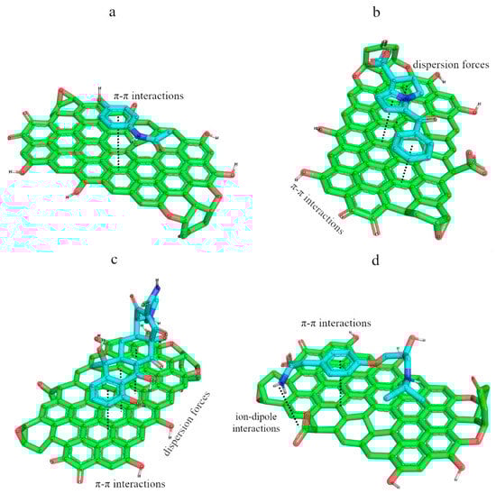 The adsorption capacities obtained from the PSO model fitting follow the same order for different model substances as the amounts of drugs adsorbed after the limited contact time obtained in our earlier study []. This confirms that the correlation of molecular properties with the adsorbed amount is due to the influence of the molecular properties on the interactions with the surface and not their influence on the adsorption rate. Estimated adsorption capacities are in line with the nature of selected drugs. Atenolol is a cation over a wide pH range, paracetamol is a neutral, tetracycline is a zwitterion, and ketorolac acquires an anionic nature. Since the AcBC-800 sample exhibits negative zeta potential, up to −10 mV in the 2–9 pH range [], the extent of interaction in the sorption system is associated with more dipole-oriented or dipole-induced than ion–ion interactions. The extent of interaction in this system relies largely on dispersion forces, hydrophobic effect [] and π–π interactions enabled by the aromatic structures of AcBC-800. Accordingly, the highest adsorption capacities were estimated for molecules with relatively low polarity and small diameters, which allow penetration into the micropores and mesopores and efficient utilization of the adsorbent surface for their retention, such as ketorolac and paracetamol. Ketorolac also has two aromatic rings, which can lead to stronger π–π interactions with the surface of the adsorbent compared to other substances. The proposed interactions of these two model substances with AcBC-800 are shown in Figure 8a,b. The only structural features of the adsorbent required for the above interactions is the presence of aromatic carbon layers of adsorbent, which means that an abundance of adsorption sites is available for paracetamol and ketorolac. On the other hand, atenolol and tetracycline are larger than paracetamol and ketorolac, which limits their entry into the micropores, and are also more polar, which limits the contribution of the hydrophobic effect to their retention. Compared to atenolol, in which the polar alkyl chains are attached to the benzene ring, tetracycline is a rigid molecule in which the benzene and two adjacent rings form a nearly planar structure. In addition, tetracycline is the most polarizable of the adsorbates tested. Thus, when π–π interactions are formed with the AcBC-800 surface, the remainder of the tetracycline skeleton is in close proximity to the surface, allowing for the involvement of dispersion interactions. In contrast, when atenolol forms π–π interactions with the adsorbent, the alkyl chains remain oriented towards the liquid phase, which limits the involvement of dispersion forces. Therefore, strong interactions in the adsorption of atenolol can only occur in close proximity to the surface functional groups, which allows for additional stabilization through ion–dipole, ion–ion and dipole–dipole interactions. Since the availability of functional groups on the surface is limited according to the FTIR and XPS analyses, only a limited portion of the AcBC-800 surface can be an efficient binding site for atenolol. The difference between the postulated binding mechanisms of atenolol and tetracycline is shown in Figure 8c,d.