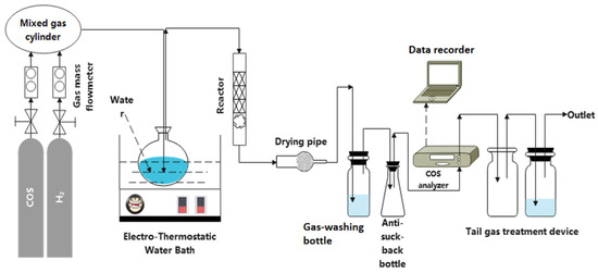 Figure 1 illustrates the schematic diagram of the COS hydrolysis experiment. COS gas (0.1% concentration) was blended with nitrogen gas in a mixing flask using a mass flow controller to achieve a COS concentration of 200 ppm. This mixed gas was then passed into a single-neck flask containing 100 mL of deionized water to introduce water vapor. An electric thermostatic water bath was utilized to regulate the temperature and maintain the desired humidity level. The outlet gas from the single-neck flask was directed into a reactor, which consisted of an 8 × 200 mm quartz tube, secured in an upright position by an iron frame. The quartz tube was wrapped with temperature-controlled tracer tape to maintain the reaction temperature, while quartz cotton was placed at the bottom of the reactor for stability. Following the reaction, the outlet gas was dried using a drying tube before entering a gas-washing cylinder containing a zinc acetate solution (0.27 mol/L). To ensure the accuracy of the COS analyzer, which detects trace amounts of hydrogen sulfide (H2S) generated during the hydrolysis of COS, it was necessary to remove H2S from the gas mixture without altering the COS concentration [27]. The zinc acetate solution effectively captures H2S while having a negligible impact on COS adsorption. To protect the COS analyzer, an anti-suckback bottle was connected to the gas-washing cylinder to prevent any foamy substances from the reaction from moving back into the pipeline. The COS analyzer was linked to a computer to record data at one-second intervals. Additionally, the tail gas treatment system included an anti-backsiphonage bottle and a wide-mouth container filled with sodium hydroxide (NaOH) solution, which efficiently absorbed both COS and H2S.