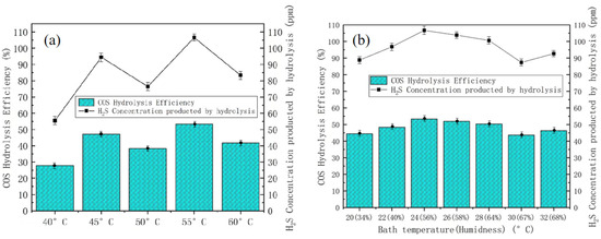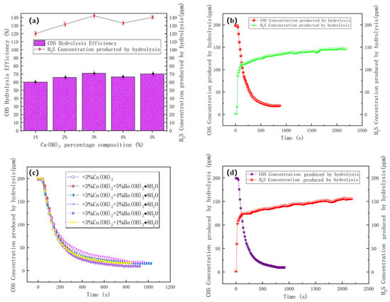 As shown in Figure 6a, the hydrolysis efficiency of COS increased with the increase carrier at ≤3% of Ca(OH)2, but the hydrolysis efficiencies at 4% and 5% were lower than that at 3% of carrier, which indicated that it was not more effective with the increase in carrier, and the solubility of Ca(OH)2, an inorganic compound that is slightly soluble in water, decreased with the temperature, and the solubility was only 1.76 g/L at 10 °C. In the ultrasonic impregnation step of the catalyst preparation, it was necessary to put ice in the ultrasonic water tank to maintain the low temperature and add more deionized water into the beaker to maintain the low temperature and the solubility of the catalyst. The solubility of Ca(OH)2 decreases with the increase in temperature, and the solubility is only 1.76 g/L at 10 °C. In the ultrasonic impregnation step of catalyst preparation, the solubility of Ca(OH)2 was improved by putting ice cubes in the ultrasonic water tank to maintain the low temperature and adding more deionized water into the beaker. The higher the addition amount, the lower the uniformity of impregnation during the preparation of catalysts, which may be the reason for the lower efficiency of catalytic hydrolysis of COS.