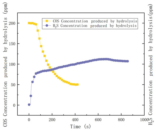 According to the above equations, if the hydrolysis reaction proceeds to completion, the molar ratio of hydrogen sulfide (H2S) to carbonyl sulfide (COS) produced from the hydrolysis reaction is expected to be 1:1. During the experiments, we observed instances where the concentration of COS detected by the analyzer fell to zero, indicating 100% hydrolysis efficiency. However, the amount of COS hydrolyzed, as inferred from the H2S concentration detected by the H2S analyzer, did not always reflect this complete hydrolysis efficiency. This discrepancy may be attributed to the adsorption of COS within the catalyst or the slight solubility of COS in water. As quantifying this error is challenging, we presented hydrolysis efficiencies as characterized by both the outlet concentrations of COS and H2S.