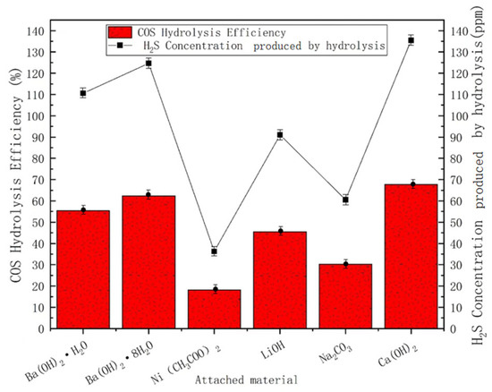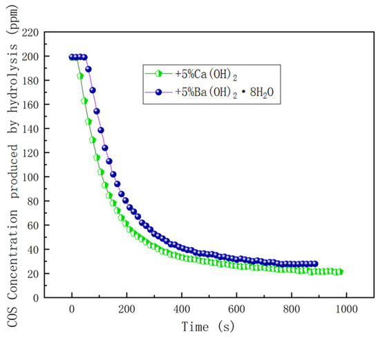The experimental results for the catalytic hydrolysis of COS using catalysts with 5% additions of Ca(OH)2 and Ba(OH)2·8H2O are shown in Figure 5. As can be seen from Figure 5, the hydrolysis efficiency of COS was 89.29% when the 3 g carrier was loaded with 5% Ca(OH)2 and 86.17% when it was loaded with 5% Ba(OH)2·8H2O. The loading effect of Ba(OH)2·8H2O was slightly higher than that of Ba(OH)2·H2O. This disparity could be attributed to the octahydrate’s higher content of dissociable OH− ions.