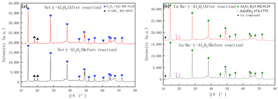 XRD characterization of γ-Al2O3 (a) and Ca-Ba-γ-Al2O3 (b) before and after COS catalytic hydrolysis reaction.