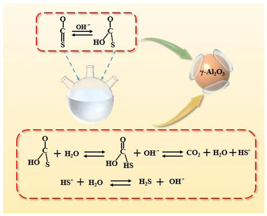 Although COS is chemically stable, it can undergo redox reactions, decomposition, and hydrolysis under certain conditions [17]. Wet removal techniques leverage the high solubility of COS in amine solutions alongside hydrolysis reactions. Common solvents for this method include diethanolamine (DEA), diisopropanolamine (DIPA), and N-methyldiethanolamine (MDEA) [18]. Zoltán et al. [19] found that the chemical adsorption of COS on n-propylamine-modified porous silica had very little effect on the chemical adsorption capacity of CO2, and the porous silica material did not undergo irreversible reactions during the adsorption process. Seo et al. [20] used methanol to absorb H2S and COS in gas mixtures and were able to increase the removal of COS from 80% to 95%. The absorption rate of COS in aqueous amine solutions was determined using a fixed gas–liquid interface reactor. It was found that the absorption performance of COS from aqueous MDEA solution was lower than that reported in the temperature range of 313–353 K, and the mass fraction of alkanolamine bounded at 0.05–0.5 [18]. Zhang et al. [21] prepared a novel absorbent (USD-2) by using MDEA as the base solvent and adding appropriate amounts of five-membered sulfur-containing heterocyclic compounds (SULs) and cycloaliphatic amines (CAs). The removal rate of COS by this absorbent was 42.4% higher than that of pure MDEA. Lammers et al. [22] introduced 25–30 wt% polyhydroxy alcohol (PHA) and glycerol into an aqueous MDEA solution to prepare a novel absorbent, which showed a significantly higher rate of COS uptake and reaction as compared to the aqueous MDEA solution. In addition to the absorption method, COS catalytic hydrolysis also has unique advantages. The hydrolysis reaction of COS occurs at a low rate constant of 0.0011 s−1 at 25 °C without a catalyst [23]. The key to the hydrolysis method for COS removal is the choice of catalyst. Most of the patents use γ-Al2O3 as the basic carrier, and the efficiency of the catalyst for COS hydrolysis is improved by loading alkaline oxides. γ-Al2O3 is a porous material with a large internal surface area, insoluble in common solvents, such as water, and with very high compressive and heat resistance. γ-Al2O3 can be converted to α-Al2O3 when the temperature is higher than 1200 °C. Huang et al. [24] investigated the catalytic hydrolysis reaction of γ-Al2O3 on COS at 220 °C and found that the presence of singlet S is trapped in the catalyst in the absence of H2/CO/CO2 and verified that formic acid does not accumulate on the catalyst during this reaction. Wang et al. [25] prepared La2O3 -Co2O3-Al2O3 and LaCoO3/γ-Al2O3 catalysts by co-precipitation and sol–gel ultrasound impregnation methods and carried out the catalytic hydrolysis of COS, and their results showed that the catalytic efficiency of LaCoO3/γ-Al2O3 was higher than that of La2O3-Co2O3-Al2O3, which was mainly related to the chalcocite crystalline form of the LaCoO3 γ-Al2O3 catalyst. Hence, the selection of appropriate transition metal active components and the development of a catalyst featuring superior performance, utilizing γ-Al2O3 as the support, holds paramount importance in the research pertaining to low-temperature COS hydrolysis [26].