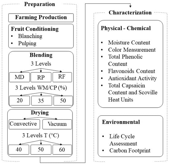 Chili peppers generally have a short shelf life after harvest and must be consumed quickly or processed to extend their shelf life [2]. Chili peppers are processed and sold as fresh products (canned, frozen and pickled), concentrated extracts (oleoresins) or dehydrated products (paprika), with the latter being preferred for logistical management and having the longest shelf life [1].