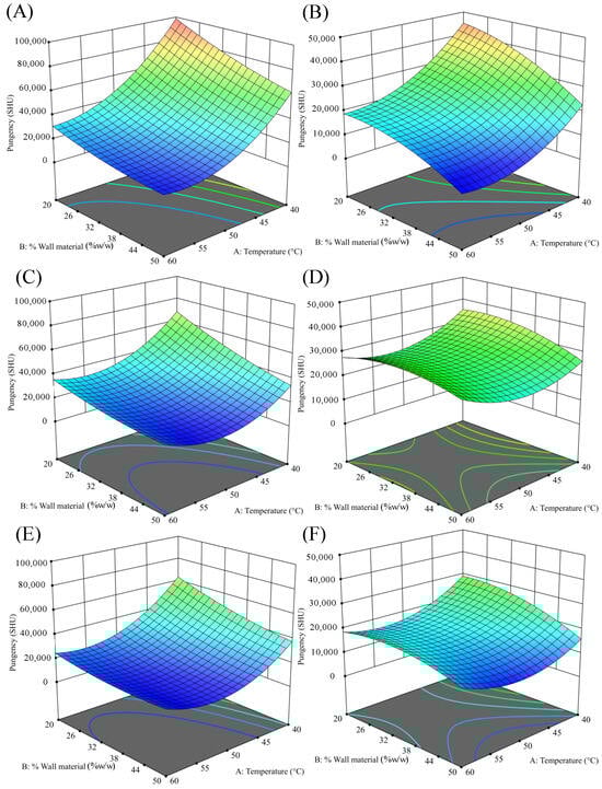 Response surface 3D plots showing the effect of the wall material ratio and temperature on the pungency (SHU) of the encapsulates. (A) Convective drying—rice flour, (B) vacuum drying—rice flour, (C) convective drying—rice protein, (D) vacuum drying—rice protein, (E) convective drying—maltodextrin, (F) vacuum drying—maltodextrin.
