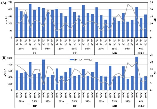 The total phenolic compounds exhibited increases in concentration between 150% and 300% during convective drying of the pulp at temperatures between 40 and 60 °C, with this increase being more pronounced at lower temperatures. While the drying temperature can influence the phenolic content of the dehydrated products, the composting of the encapsulated powders by hot air in this study aligns with the findings reported by Campos et al. [48] in their research on the drying of jalapeño peppers using convective and smoked drying techniques. In both studies, an increase in the total content of phenolic compounds in the dried products was observed. The increase in total polyphenols during thermal processing has been reported for vegetable tissues. This is attributed to the liberation of polyphenols from the intracellular protein complexes, changes in plant cell structure, matrix modifications [49] or the inactivation of the polyphenol oxidases that prevent oxidation and polymerization of polyphenols [50].