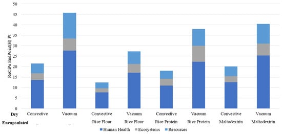 Following the optimization of the chili pulp encapsulation process, which was based on maximizing pungency and polyphenol content and minimizing color changes, the most promising products were selected for a comparative environmental assessment. Two tools were selected for this purpose: life cycle assessment (LCA) and carbon footprint. Both are referred to as ISO standards [32,33] and adhere to the LCA methodology. The LCA considered four phases: goal and scope, life cycle inventory (LCI), life cycle impact assessment (LCIA) and life cycle interpretation. The SimaPro software version 8.3 and the ecoinvent 3.2 and Agri-footprint databases were employed to model the LCA, and the carbon footprint emissions were estimated through primary measurement data.
