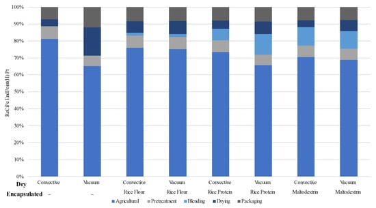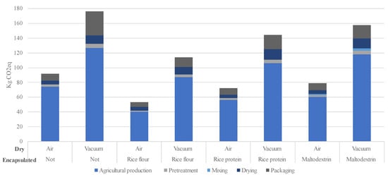 The objective of this study was to analyze the technical and environmental aspects of producing encapsulated Rocoto red chili powder using three different wall materials: maltodextrin (MD), rice protein (RP) and rice flour (RF), along with two drying methods (convection drying and vacuum drying). From a technical standpoint, our objective was to produce an encapsulated product that exhibits high pungency and a bright red color, which are significant factors influencing consumer purchasing decisions. Additionally, we also aimed to minimize the impact on polyphenol, flavonoid and antioxidant activity contents. Once optimal conditions for each wall material and drying system were established, an environmental assessment of the various alternatives was conducted to recommend processes that achieve the best technical and environmental performance.