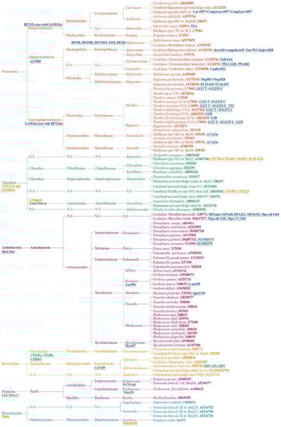 Based on the amplification of the 16S rRNA gene and high-throughput sequencing results, a summary of 94 important filamentous bacteria belonging to 42 genera and six phyla that are widely present in sewage treatment plants and can be retrieved from the NCBI database [43,44,45] has been presented. Figure 1 shows the systematic development of important filamentous bacteria and the retrieval sequence of representative bacterial species. The filamentous bacteria and their related sequences are shown in Figure 1. When retrieving annotations, the e-value is set to 1 × 10−60, and the minimum similarity between the reference and query sequences is about 87%. For each annotated sequence, only list the closest reference sequence and filter the results: (1) remove results with similarity less than 95% (if identified by FISH probe, set to 90%); (2) delete pyrotags with more than two bases uncovered (i.e., 200 bp pyrotags with query coverage less than 99%) [62,63]. The abundance calculation formula is as follows (Formula (1)):
