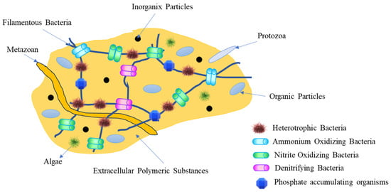 In 1914, the British Arden and Lockett [1] first introduced the concept of activated sludge and developed a process thereof. This method is suitable for various wastewater quality levels, has flexible and diverse operation modes, has high pollutant removal efficiency, has low operation cost, and has strong controllability. It is the most widely used biological wastewater treatment technology at present. Similar to soil and sediment, activated sludge is a highly complex system composed of bacteria, archaea, eukaryotes (protozoa and fungi) and viruses, with bacteria dominating and existing in the form of bacterial micelles [2,3]. From a morphological perspective, fungal flocs comprise flocculent and filamentous bacteria. For activated sludge systems, filamentous bacteria play a crucial role. They not only contribute to wastewater purification through biochemical processes, thanks to their larger specific surface area and greater capacity to absorb low-concentration pollutants than flocculent bacteria, but also serve as a supporting skeleton. In this physical role, filamentous bacteria and flocculent bacteria act as “bone and meat”, with the latter attaching to the “skeleton” with extracellular polymers such as pectin and polysaccharides [4,5,6].