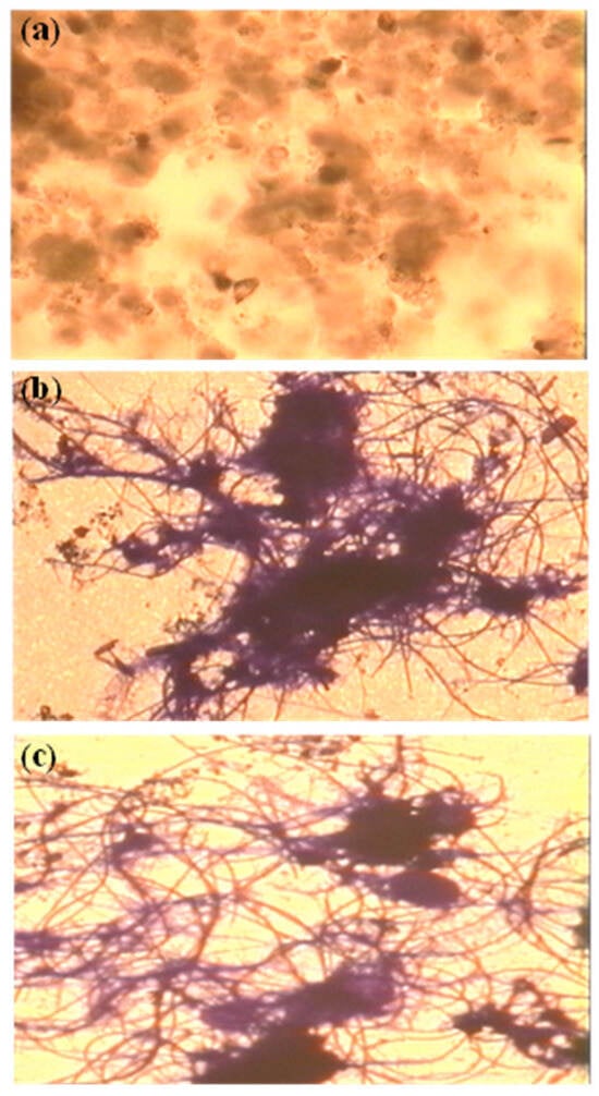 Phase contrast micrographs of flocs (original magnification ×400) [64]. (a) The flocs during non-bulking period (T = 17–26 °C, SVI = 90 mL/g); (b) the flocs during initial sludge bulking period (T < 15 °C, SVI = 248 mL/g); (c) the flocs during serious bulking period (T < 15 °C, SVI = 391 mL/g).