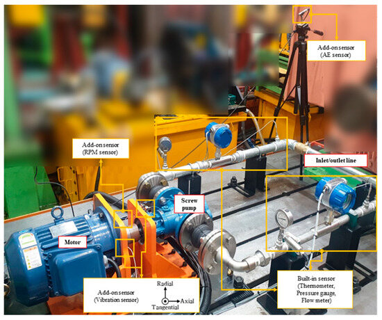 The aforementioned failures were tested using the test bed. Through these experiments, data on the flow rate, pressure, temperature, noise, vibration, and RPM were acquired. Vibration data are primarily used for diagnosing rotating machinery [2,3,4]. Diagnosis through vibration is more accurate and cost-effective compared to other diagnostic methods. Therefore, using vibration data to diagnose failures is an efficient choice.
