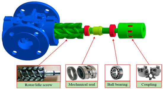 The structure of the pump can be broadly divided into four main components: coupling, bearing, mechanical seal, and shaft. The coupling transfers power from the motor to the pump’s shaft. The bearing is an essential component for any rotating machinery. The mechanical seal prevents the internal oil of the pump from leaking to the outside. The shaft is connected to the rotor and helps to form the internal pressure of the pump. These components of the pump are arranged in a serial structure, meaning that the failure of one component can significantly impact the others. To understand how a failure propagates to other components and to evaluate the potential for compound failures, a structural analysis was conducted. If a structural analysis assuming failure mode indicates that significant stress is exerted on other components, it is likely that those components may also develop failure. Figure 3 shows the structural analysis results of a bearing sticking failure.