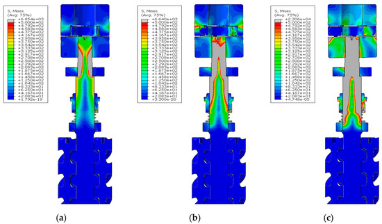 Figure 3. Structural analysis at bearing failure: (a) 10-degree rotation; (b) 20-degree rotation; (c) 30-degree rotation.