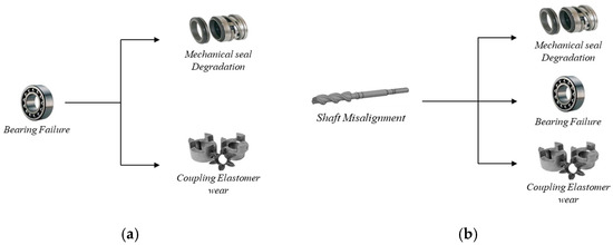 Figure 4. (a) Secondary failure by bearing failure; (b) secondary failure by misalignment.