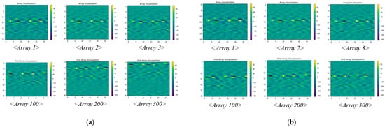 Figure 6a shows the arrays before applying the error compensation. While the first, second, and third arrays appear consistent, the 100th, 200th, and 300th arrays exhibit slight delays. The images in Figure 6b show the arrays after applying the error compensation. Consistent arrays are generated not only for the first, second, and third arrays but also for the 100th, 200th, and 300th arrays. The images in Figure 6 visualize the generated arrays. These images are not directly used for training; instead, the data from the 2D arrays are utilized. Figure 7 shows the arrays for the normal state and the five failure states. The consistent appearance of the features across the fault patterns, from the first to the 300th array, can be observed. Figure 7 intuitively represents the differences in the vibration patterns that occur with each fault, allowing for the identification of unique array structures for each fault. This figure enables the visual verification of the data that the CNN model will use to extract the features.
