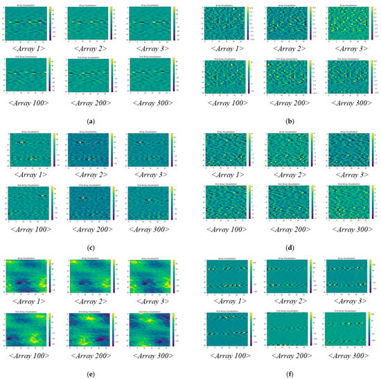 Figure 7. Visualization of the arrays of six states: (a) normal; (b) bearing; (c) mechanical seal; (d) elastomer; (e) misalignment; (f) cavitation.