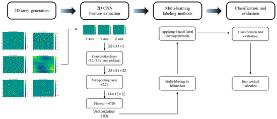 By applying convolutional layers to the arrays, the spatial features of the arrays were learned, and the data was vectorized through a flattened layer to be used as input data for various classifiers. CNNs are typically applied to data with a two-dimensional grid structure, such as images. In the case of standard RGB images, each image has a two-dimensional structure of width and height, with each pixel having three channel values: R, G, and B. The vibration data obtained from the experiments were collected using sensors that capture data along three axes simultaneously. The input data used for CNN training had a structure of (31, 28, 3), with each of the three axes of data forming an array. This is analogous to how a 2D color image is trained with three channels (R, G, B). The structure of the CNN used was as follows. It consisted of 32 filters of size (3, 3), and the activation function used was ReLU. Zero padding was applied to maintain the data at the edges of the 2D array. A max-pooling layer with a window size of (2, 2) was then used to reduce the dimensionality of the feature maps and improve the computational efficiency. After the max-pooling layer, the data were passed through a flattening layer, which converted the 2D feature maps into a 1D vector, preparing the data for classification by various classifiers. This overall flowchart is shown in Figure 8. Through this structure, the CNN can learn the structural features of the 2D arrays representing the acceleration data for one rotation of the pump.