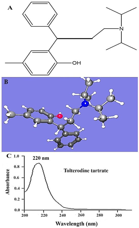 Various methods have been employed to assess its stability, pharmaceutical properties, and enantiomeric ratios (even enantiomer impurities), using chiral HPLC (high-performance liquid chromatography), and simultaneous estimation using different column types and mobile phases (including variations in pH levels) [6,7]. Apart from HPLC, alternative ultra-performance LC (UPLC), high-performance thin-layer chromatography (HPTLC), and spectrophotometric methods (evaluating coupling reactions) have also been developed for the estimation of TOT [8,9]. Furthermore, a mass spectrophotometric technique has been reported to measure TOT in the human plasma in combination with tamsulosin [6].