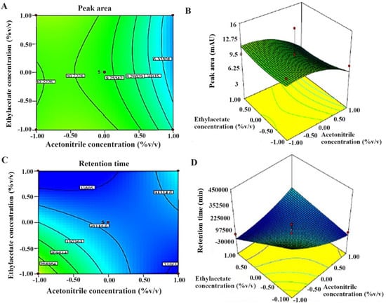 The 2D and 3D response surface graphs reveal the effect of significant factors on responses (A,B), peak area, and (C,D) retention time. Design Expert software generated 3D response surface graphs and 2D contour plots.