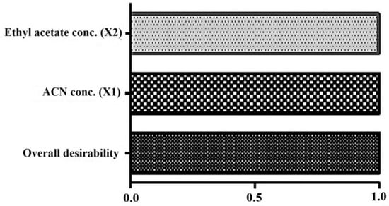 One-way analysis of variance (ANOVA) was applied as a statistical tool to check the variability in the experiments. The values of various statistical parameters are given in Table 3. The low p values of X1 and X2 were estimated as 0.0045 and 0.0062, respectively, suggesting the best fit of the model (quadratic polynomial) [12,13]. Furthermore, the desirability value was close to 1 (0.9988), suggesting that all considered factors were within the model while optimizing (Figure 5).