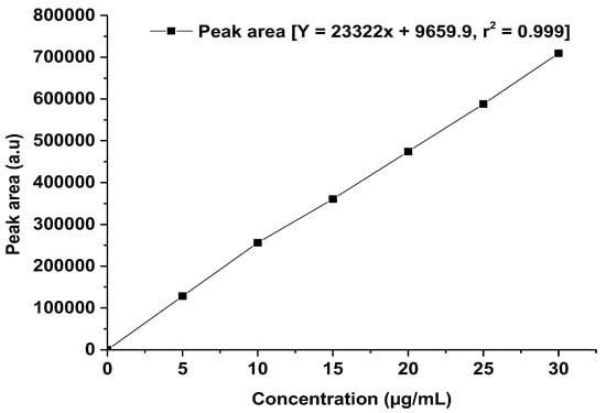Using the stock solution as a source, portions of 0.5, 1, 1.5, 2, 2.5, and 3 mL were extracted and placed into 10 mL volumetric flasks for linearity. These portions were diluted up to the mark using the mobile phase, which resulted in a final concentration range of 5–30 µg/mL. Each sample (20 µL) was introduced using a Hamilton syringe. For every concentration, measurements were replicated six times. A calibration curve was constructed by plotting the drug concentration against the peak area.